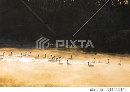 埼玉川島町の冬 白鳥飛来地 川霧の中に佇む白鳥