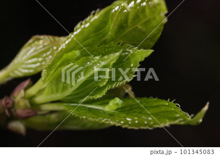 自然 植物 ハナイカダ、四月初め。芽吹いた若葉にもう蕾がついています