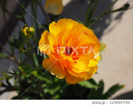 黄色八重咲きラハナキンポウゲ花の中心アップ(マクロレンズ・自然光接写写真)