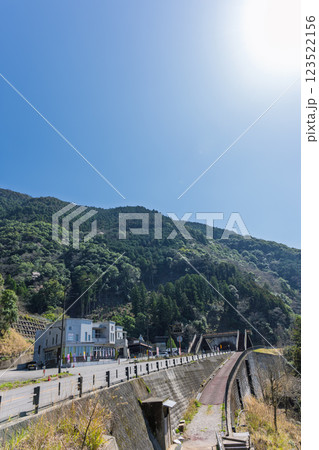 春の陽ざしに映える市房ダム・駐車場風景 (桜の花が咲く季節) (熊本県球磨郡水上村湯山)