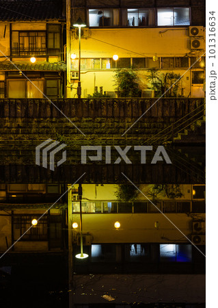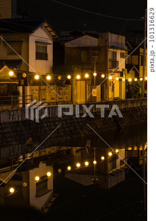 日本 香川県仲多度郡の琴平町を流れる金倉川沿いの夜景
