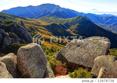 瑞牆山山頂から見る紅葉の金峰山と富士山