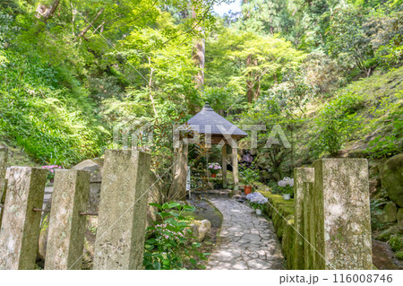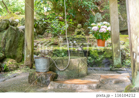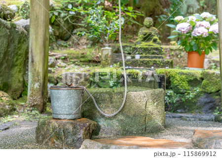 奈良県明日香村 岡寺のあぢさゐ回廊の紫陽花と瑠璃井とつるべ桶とお地蔵さん