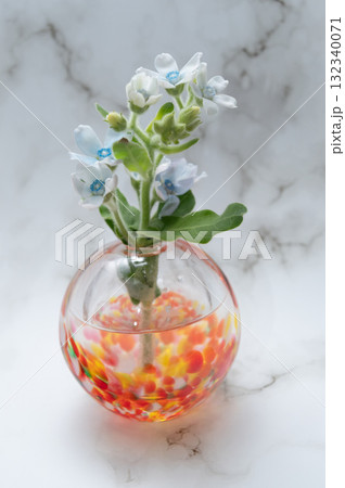 寒色透明なガラスの一輪挿しに生けられたブルースター(中配置)