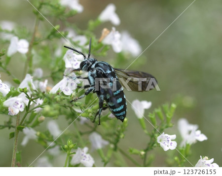 生き物 昆虫 ルリモンハナバチ、黒地にブルーの短毛によって縞模様が描かれた美しいハナバチ②