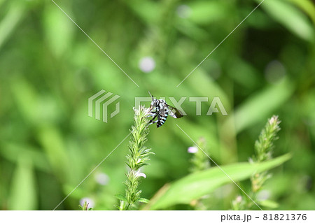 生き物 昆虫 ルリモンハナバチ、黒地にブルーの短毛によって縞模様が描かれた美しいハナバチ①