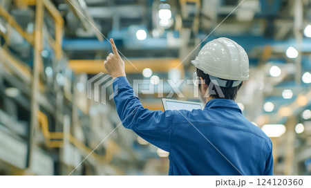 現代の工業エンジニア、防護装備を着用、タブレットでスマートファクトリーの運営を監視