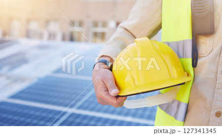 Engineering, solar energy or hand with helmet for safety while working on photovoltaic development project. Industry hat, solar panels or construction worker working on building rooftop maintenance