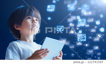 スマートタブレットと光る未来的なインターフェースで AI を学ぶ子供 タイトル変更
