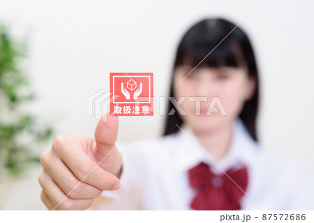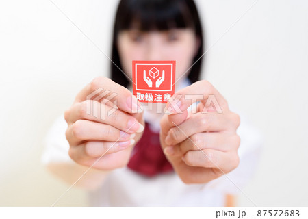 気難しい時期の女性 女子高校生 思春期 取扱注意のシールを持つ 正面