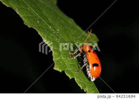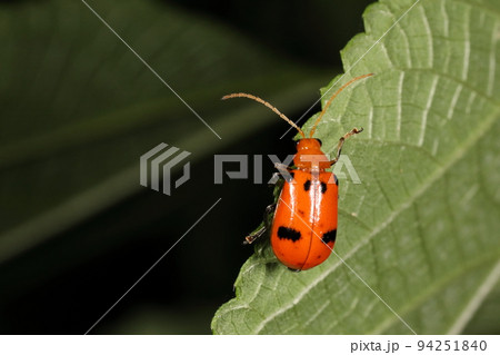 生き物 昆虫 フタイロウリハムシ、大きさは七~八ミリ。橙色に黒い斑紋、美しいハムシですがウリ科の害虫