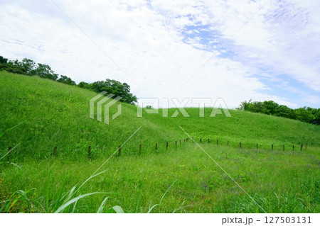 初夏の緑豊かな古墳群 雲の浮かぶ青空の下で