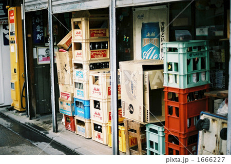 店の裏に置かれたビールケースと積み重なった買い物かご