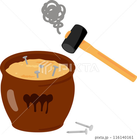 糠床に刺さった釘と金槌、糠に釘
