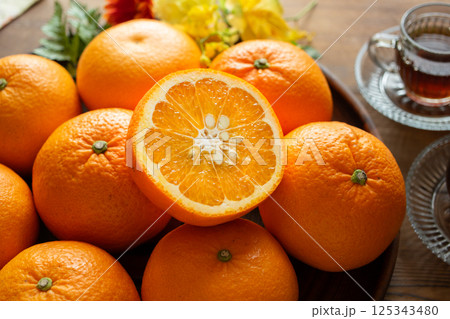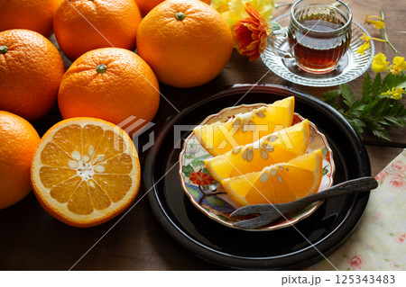 ガラスの器に入った缶詰のみかんと甘夏みかん