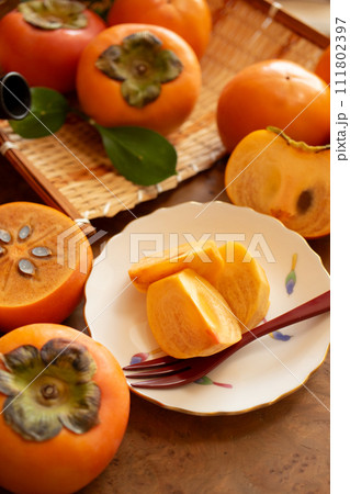 採れたてで美味しそうな秋の味覚の柿の手描き水彩イラスト