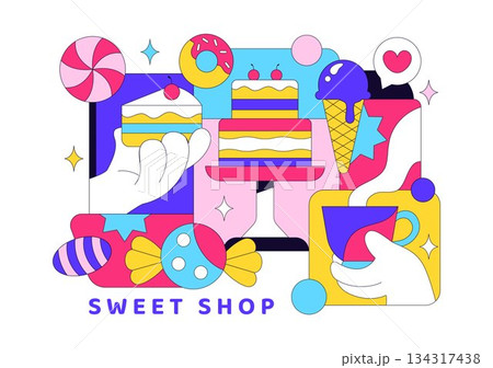 Sweet Shop Vector Illustration Featuring the Sale of Various Bakery Products, Cupcakes, Cakes, Pastries, or Candy in a Flat Style Cartoon Background
