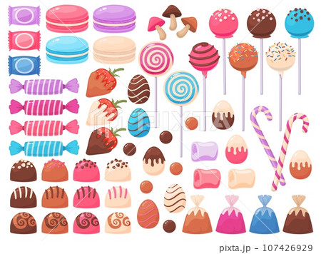 Cartoon sweets. Kids desserts. Sugar products. Yummy lollipops. Chocolate bonbons. Caramels and different candies. Strawberry with glaze. Cake and jelly confectionery. Recent vector set