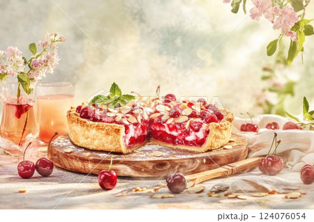 Cherry almond tart displayed on wooden board with fresh cherries and floral elements in a bright setting