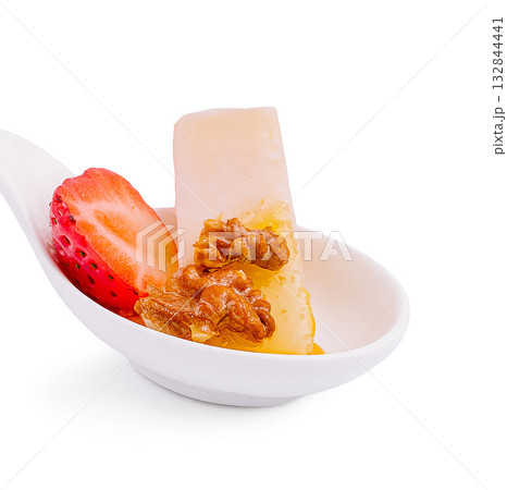 Delicious dessert featuring fresh strawberries, nuts, and delectable jelly