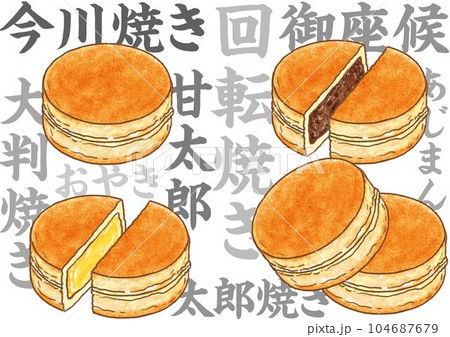 いろいろな名前で呼ばれる丸い焼いた和菓子_今川焼き_大判焼き_二重焼き_回転焼き_色々な名前入り