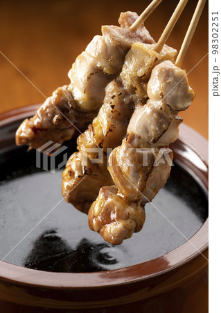 焼き鳥(ねぎま、つくね、ぼんじり)をタレに漬ける