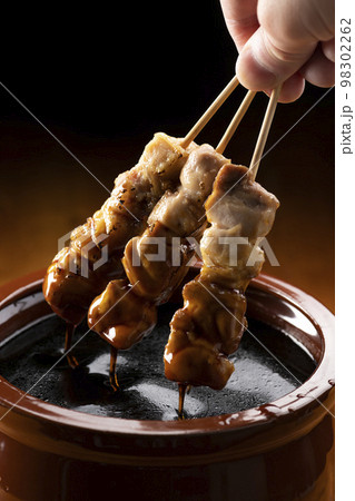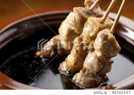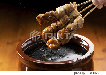 鶏のモモ肉の串焼きをタレ壺の中の焼き鳥のタレに漬ける