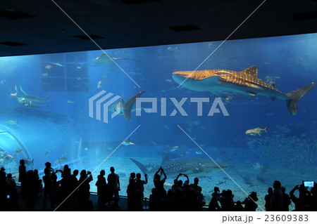 沖縄県、美ら海水族館の黒潮の海水槽を泳ぐジンベイザメ