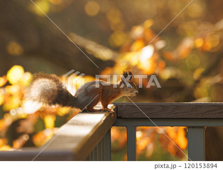 Curious squirrel exploring a wooden railing amid colorful autumn leaves in a sunlit forest setting