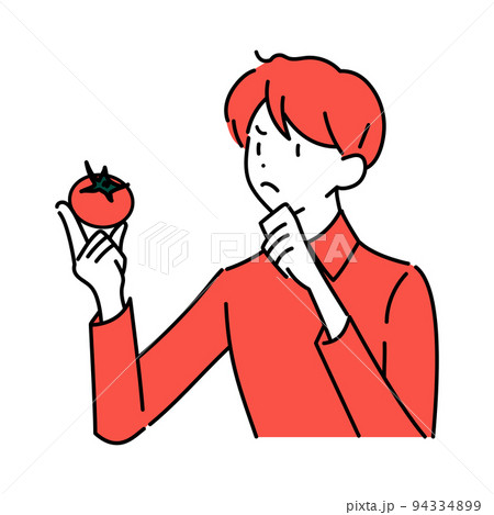 トマトと男性。トマトの栄養素、食育について考える男性。トマトを手に持った男性のベクターイラスト素材。
