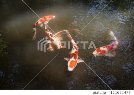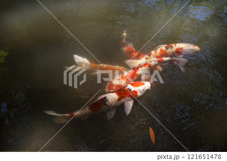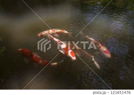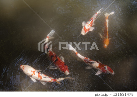 池で泳ぐ色鮮やかな錦鯉の群れ
