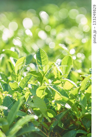 Sunlit green tea leaves with dew in lush natural garden setting with bokeh