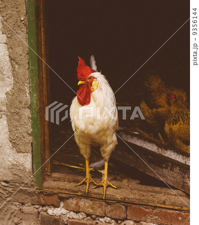 White chicken looking out of the barn