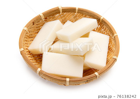 竹ザルに盛られた角餅 ちゃぶ台の四角い餅 東の角餅 切り餅
