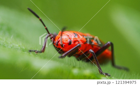 Close-up of a Bright Red Bug Perched on a Leaf, Featuring Striking Black Patterns and a Soft, Green Background for Contrast