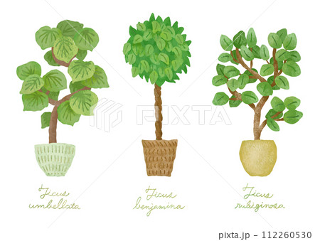 観葉植物のイラストセット-ウンベラータ・ベンジャミン・フランスゴム
