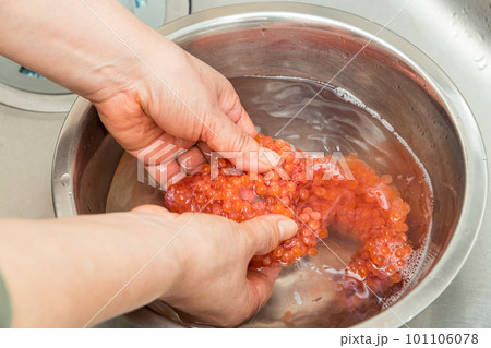 【イクラの醤油漬けを作るために、ほぐした生イクラをすすぐ】