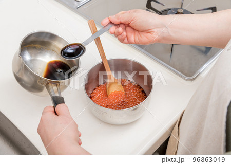 【イクラの醤油漬けを作るために、生イクラを自家製タレに馴染ませる】