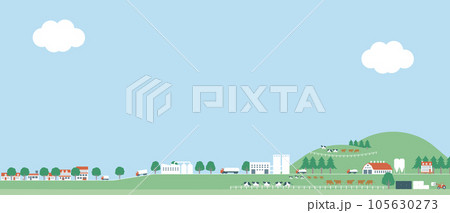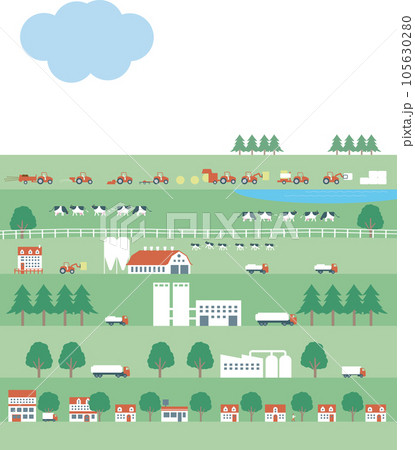 牧場と牛乳生産。田舎と都会流通イメージイラスト