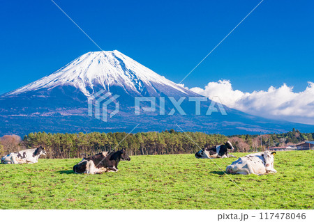 静岡県富士宮市の朝霧高原牧場の牛の群れと雄大な富士山