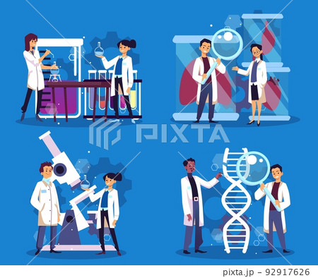 Scientists working in the field of bio and genetic engineering, flat vector illustration isolated on blue background.