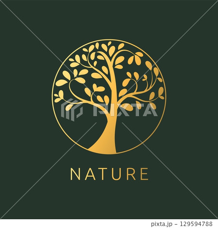 Nature logo. Organic natural logotype design with golden tree silhouette, gold leaves in circle, round form emblem. Botanical garden foliage symbol, herbal badge. Vector isolated minimal illustration