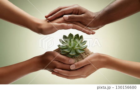 Diverse hands protecting a small green succulent plant in soil, symbolizing environmental care and growth