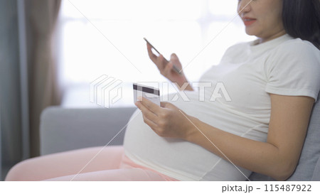 A portrait of happy Asian pregnant woman using a mobile phone device with credit card, shopping online in bedroom at home. Having a baby. Family people lifestyle. Mom love.