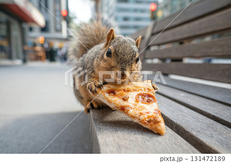 Chubby squirrel struggles to carry a slice of pizza in the city during daytime