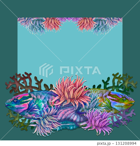 Colored background with rainbow tropical parrotfish among vibrant corals, anemones. Watercolor square frame template for marine designs, cards, stickers, scrapbooking, textiles, diving, snorkeling.