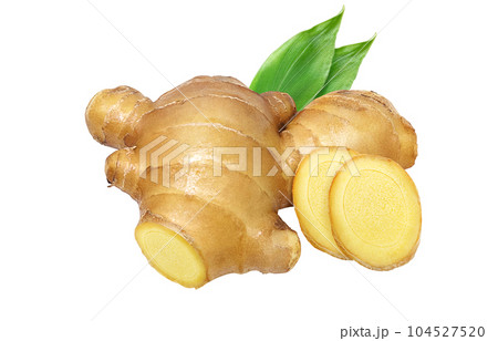 Fresh ginger rhizome and sliced ginger rhizome with split green leaves on white background.
