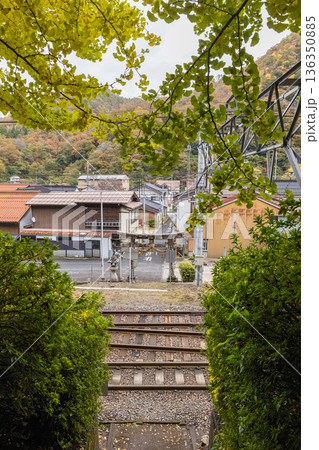 日本 鳥取県日野郡日南町にある境内の中を電車が横切る生山神社の紅葉