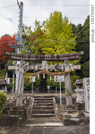 日本 鳥取県日野郡日南町にある境内の中に線路がある生山神社と紅葉