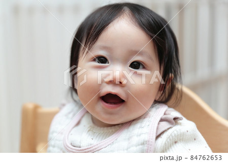 ベビーチェアに座る生後半年の赤ちゃん